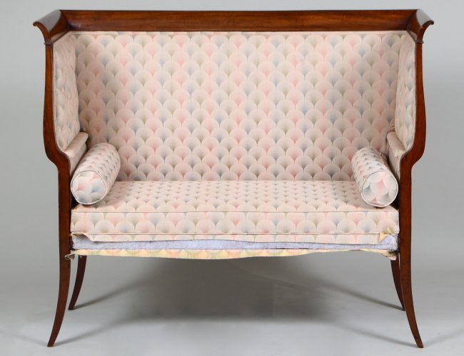 Probably English. Circa1900. With upholstered rectangular back, flanked by shaped arms with a loose cushion seat, on flared legs. Height 46 1/2". Width 55". Depth 22 1/2". (Cond: good) (400/600)