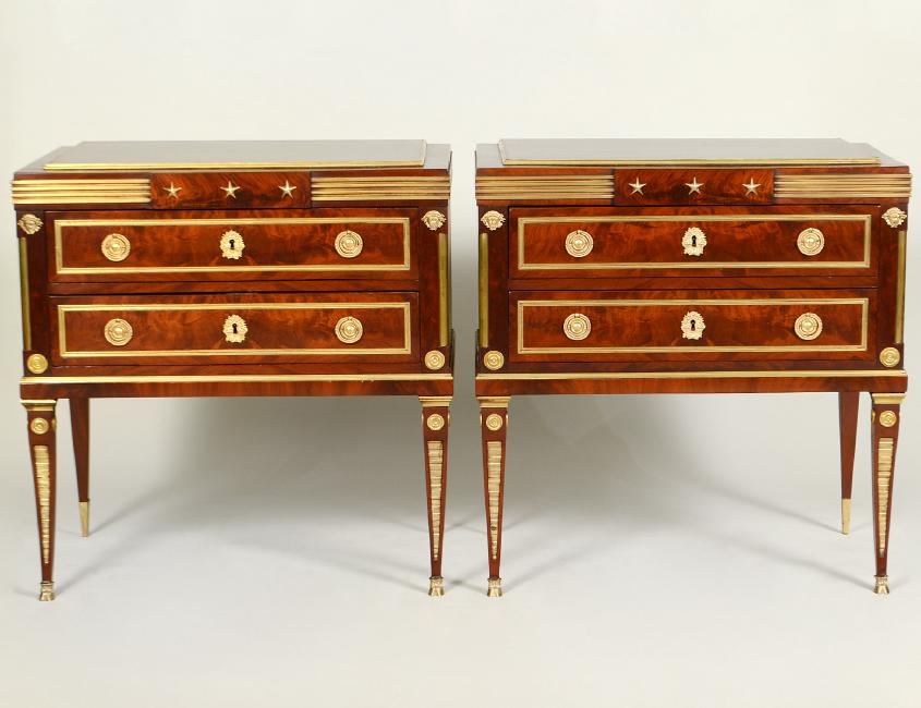 Neo-Classical style. The rectangular top above two drawers with gilt borders, applied with ribbed panels and rondels, on straight tapered legs. Height 31”. Width 29 ¾”. Depth 17 ½”. (Cond: good) (2000/3000)
