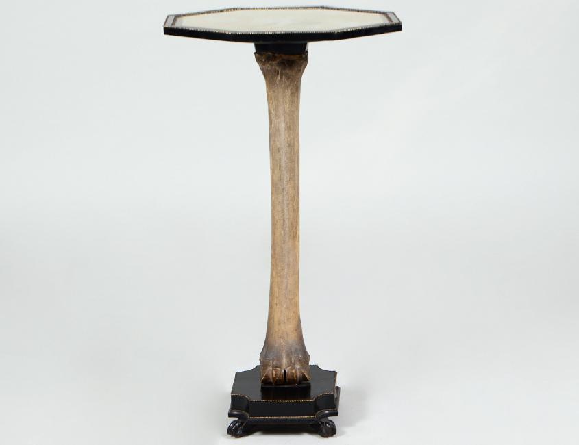Early 20th Century. The octagonal mirror top with ebonized borders, raised on a calcified bone set upon a square base with carved paw feet. Height 35”. Diameter 21”. (Cond: good) (600/800)