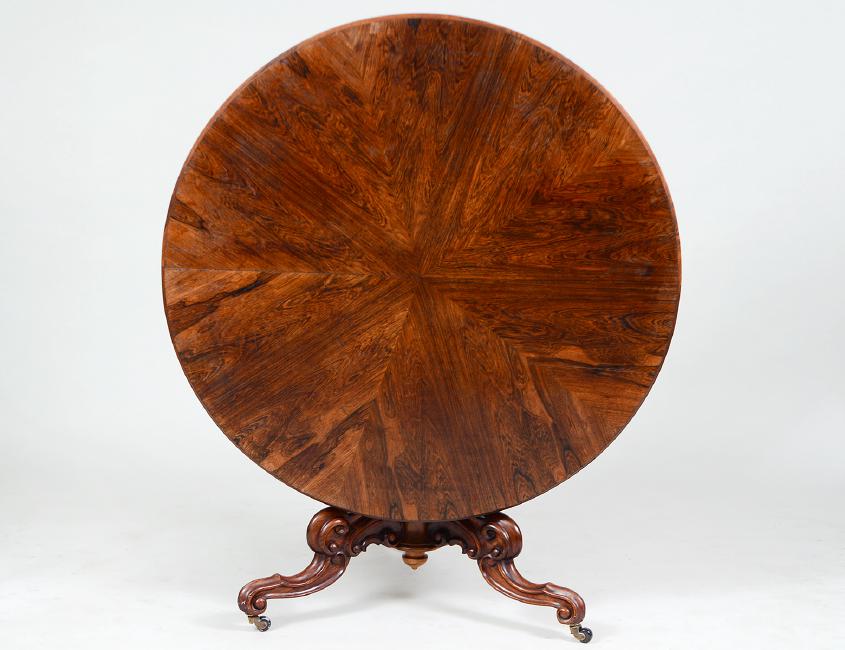 English. Circa 1860. The rosewood veneered circular tilting top, with a carved recessed pierced pendant frieze, the carved columnar turned standard with flowers and a band large beads, on leaf-carved scrolled legs, on casters. Height 32”. Diameter 42 ½”. (Cond: good, nice color and proportion) (1000/1500)