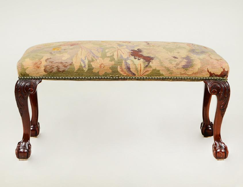 20th Century. The rectangular needlework upholstered seat on acanthus carved cabriole legs ending in claw and ball feet. Height 17”. Width 35”. Depth 18”. (Cond: good) (500/700)