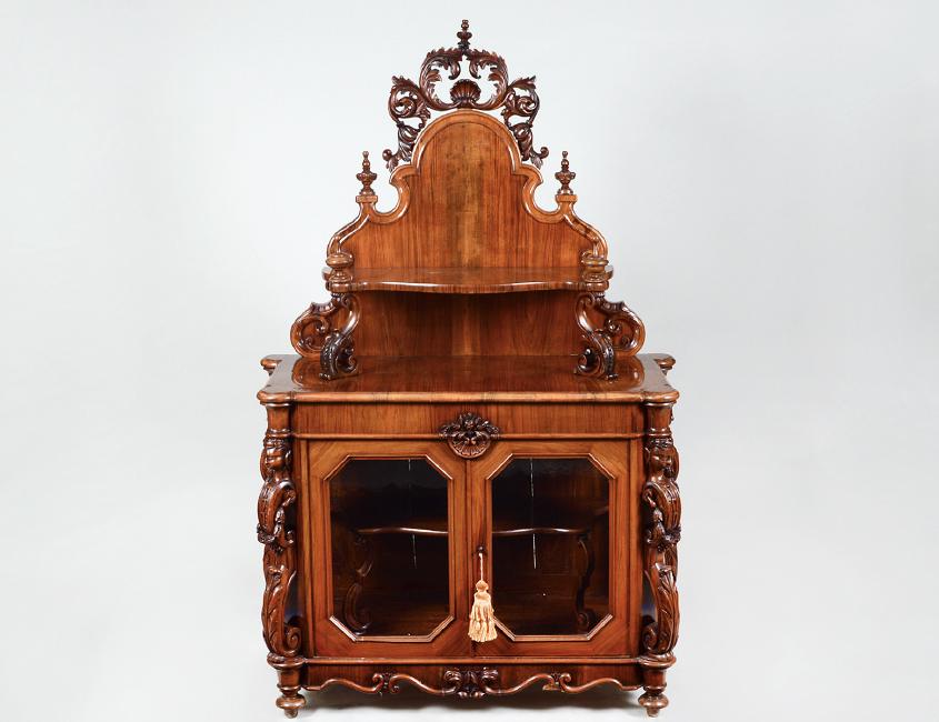 Possibly Italian. Circa 1860. The rectangular top with a scroll-supported shelved superstructure, the body with two glazed doors flanked by scrolls carved with garlands and surmounted by a female head, the shaped skirt on turned feet. Height 6’ approx. Width 4’ 2”. Depth 22 ½”. (Cond: good, nice color, minor loss to one scrolled edge) (2500/3000)