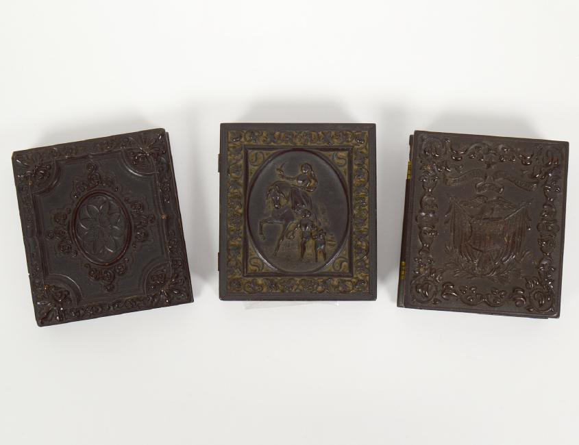 One containing a daguerreotype of a young girl; one containing a tintype of a couple; and the third case empty. (Cond: noticeable wear to hinge side of one case, otherwise expected wear) (100/150)
