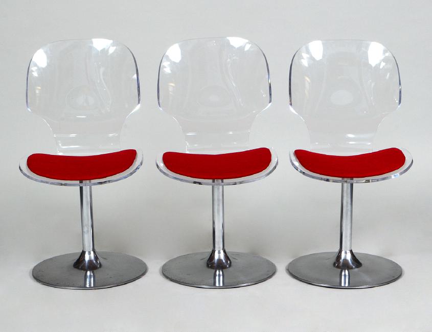Circa1980. Hill Manufacture. The Lucite backs and seats with affixed upholstered pads, swiveling above a columnar and circular dished base. Height, back to floor 33”. (Cond: good) (600/800)