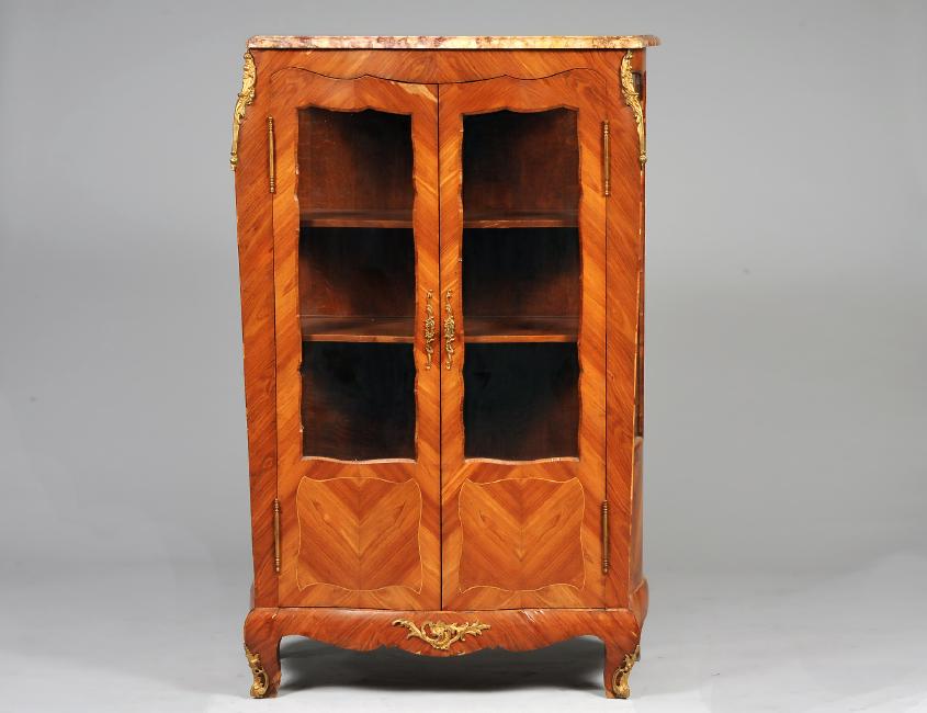 French. Circa 1920. With serpentine fronted marble top. Height 56 1/2". Width 36 1/2". Depth 16 1/2". (400/600)