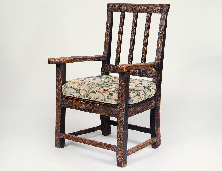 18th Century. Probably North Counties. The rectangular spindle-inset back, the plank seat on legs, carved allover with various geometric and foliate motifs. Height 38”. Width 25 ½”. (Cond: good, split to seat, wear, some stretchers probably replaced) (200/300)