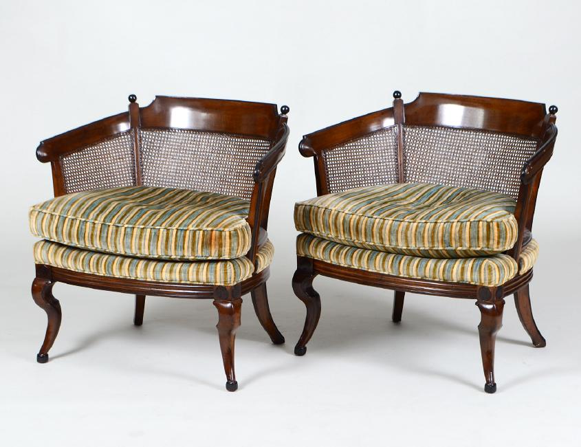 Modern. Each curved crest rail continuing to form the arms, above a tripart caned back, with upholstered seat and loose cushion, on scroll-curved legs. (Cond: good, surface stained) (300/500)