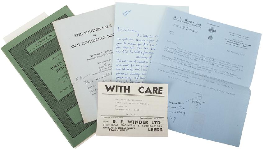 Winder, Roland. Check List of the Older Books on Conjuring in the Library of Roland Winder. [Leeds], 1966. From the limited deluxe gift edition, gilt-stamped blue leather, marbled endleaves. Tipped-in frontispiece and author’s portrait. Plates. Wide 8vo. Light scratches to cover; near fine. With three airmail letters and one postcard from the author to John Henry Grossman, each signed “Roley”, a copy of Winder Sale of Old Conjuring Books (1974; number 84 of 250 copies, signed by Trevor Hall), a copy of the Sotheby’s auction catalog of Winder’s library, and several related pieces of correspondence.
