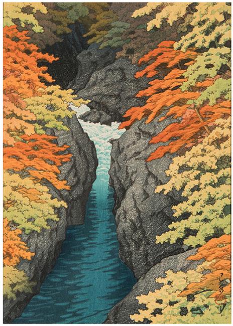 [Japan] Hasui, Kawase. Four Woodblock Prints. Comprising Hamamachi Kagishi (Fisherman's Wharf, Tokyo), Isetatsu, pubs., August 1939; Yoshino zaodo (Zaodo Temple at Yoshino), Watanabe, 1950; Autumn Scene at Shiobara, 1922; and Azuma Kyo (Azuma Chasm), printed and cut by Gintaro, 1943. Approx. 15 x 10" each.