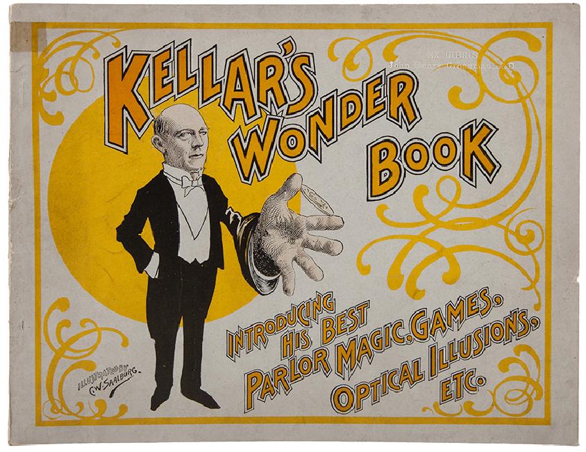Kellar, Harry. Kellar’s Wonder Book. Nashville: The Brandon Company, 1903. Publisher’s color pictorial wrappers. Illustrated by C.W. Saalburg. Oblong 8vo. Minor chipping, small tape repair to spine, else very good. Rare. A genuine rarity in American conjuring books, and one of only a handful of examples known. Most likely produced as a “pitch” book or a newspaper promotion used to advertise Kellar’s shows. Saalburg’s illustrations explain the tricks, games and shadowgraphs inside. The artist was a well known political cartoonist and inventor of printing equipment who had a long and successful career. He also played a role in the development of the famous Yellow Kid cartoon.