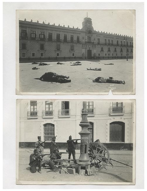 [Mexican Revolution] Ramos, Osuna. A group of 28 black and white photographs of the Mexican Revolution and aftermath in Mexico City, ca. 1910-1920. Gelatin silver prints. Signed in the plate. Showing troops in action, bodies lying in the streets, crowds gathered and the damage done by the Federal forces. 4 1/2 x 6" each.