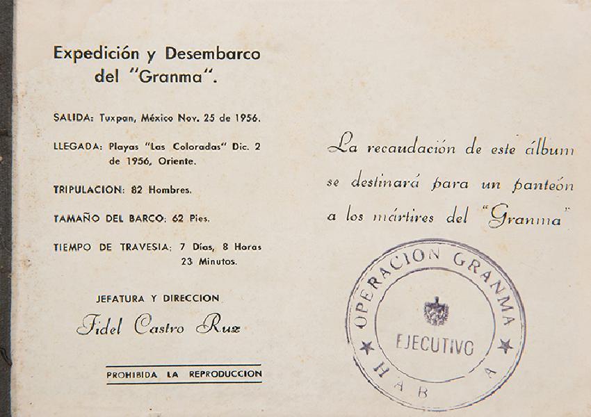 [Cuban Revolution] Expedicion y Desembarco del "Granma. " Havana, n.d. (ca. 1959). The Granma yacht departed Tuxpan, Mexico, November 25, 1956. Arrived at "Las Colorados" December 2, 1956, carrying 82 Cuban revolutionaries under the direction of Fidel Castro, for the purpose of overthrowing Batista. The Granma is on permanent display in Havana. Honoring 81 of the passengers with their photographic portraits (some indicated as dead), including the young Castro brothers and Che Guevara. Scarce relic of the Cuban revolution. Title leaf and 29 leaves. Black limp leather tied with string, featuring a ship and lettering in yellow on the front cover. Front cover reads: Album Expedicionarios del "Granma." Light wear to covers; a few small indents from metal corners carrying over to first and last couple of pages.