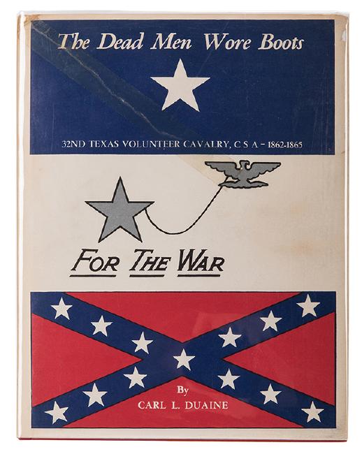 [Texas] Duaine, Carl L. The Dead Men Wore Books. 32nd Texas Volunteer Cavalry, CSA 1862-1865. Austin: The San Felipe Press, (1966). Signed limited edition with a signed note laid in. Number 193 of 500 copies signed by Carl Duaine on the limitation page. Signed note laid in: "If you are a descendant Please let me know - Carl." Publisher's red cloth. Dust jacket. 4to.