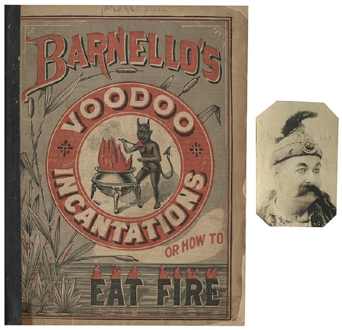 Barnello, E. Barnello’s Voodoo Incantations, or How to Eat Fire. New York: Benedict, ca. 1890. Color pictorial wrappers depicting a fire-eating imp, rear advts. of publisher’s dime handbooks. With photographic portrait of the author, previously tipped-in, annotated by Grossman: “From W.W. Durbin Collection, presented to me by Dave Price/ 3/56”. p. [1] 2—61 + 1 leaf advts. Spine reinforced, wrappers chipped, yellowing inside from photo adhesive, Grossman bookplate front inside cover, ownership stamps of Jacob Eilperin.