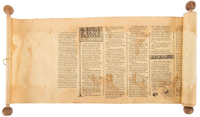 Andruzzi, Tony (Tom Palmer). The Legendary Scroll of Masklyn Ye Mage. [Chicago], ca. 1975. Handmade scroll with wooden handles, explaining many of Andruzzi’s magical effects. From a limited edition, with author’s enclosure. Margins soiled, as issued to appear aged.