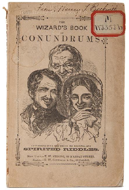 [Anderson, John Henry] The Wizard’s Book of Conundrums. New York: T.W. Strong, 1852. Pictorial buff printed wrappers. 8vo. p. [i—iii] iv [5] 6—108. Covers lightly soiled, old inventory label and ownership signature, title page annotated in pencil. Toole Stott 44.