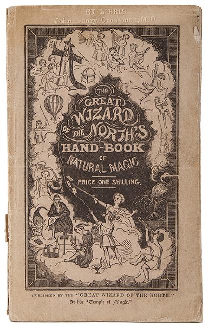 Anderson, John Henry. The Fashionable Science of Parlor Magic. London: R.S. Francis, Printer, ca. 1846. Twentieth edition. Publisher’s pictorial wrappers. 8vo. p. [i—iii] iv—xiv, [1] 2—71 + 1 leaf to Amateurs. Frontispiece portrait, dedication page on pink paper, illustrated with woodcuts. Firmly bound, foot of backstrip peeling, short tears and chips to covers. Toole Stott 23 (see difference in pagination). Accompanied by a 1965 letter from Joe Berg, from whom Grossman purchased the book.
