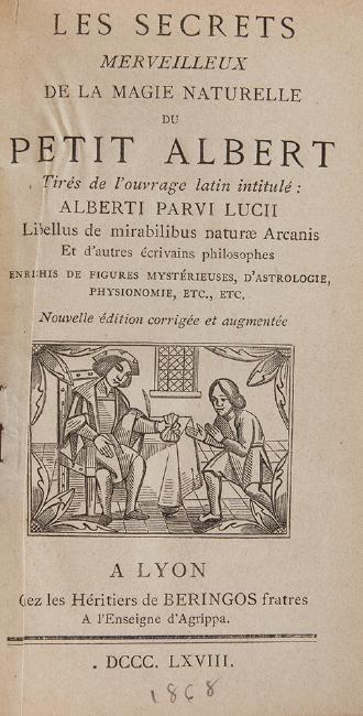 Albertus Parvus. Secets Merveilleux de la Magie Naturelle et Cabalistique du Petit Albert. Lyon: Chez les Heritiers de Beringos Fratres, 1868. Contemporary quarter leather, gilt spine, edges and endsheets marbled. Frontispiece, folding plates, numerous illustrations. 12mo. Short tears to a few pages, else a clean copy. Sections on physiognomy, chiromancy, and various forms of magic and prophecy.