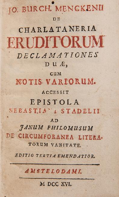 Mencke, Johann Burkhard. De charlataneria eruditorum. Amsterdam: s.n., 1716. Title page in red and black. The author is a supposed forbear of H.L. Mencken. Vellum. 12mo.