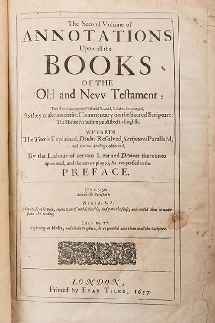 [Bible] Annotations upon all the Books of the Old and New Testament. London, 1657. Two volumes. Contemporary calf. Folio. Boards worn, broken at the top corner with loss to spines. Manuscript ex-libri.