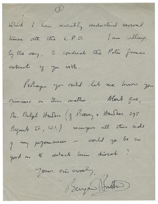 Britten, Benjamin. Autographed Letter Signed Regarding Peter Grimes. One page, incomplete, final page only. S.l., n.d. To an unknown recipient. Britten writes: "which I have recently conducted several times with the L.P.O. I am willing, by the way, to conduct the Peter Grimes extract if you wish. Perhaps you would let me know your opinions on the matter. About fee, Rev. Ralph Hawkes (of Boosey & Hawkes, 295 Regent St) manages all this side of my performances - would you be so good as to contact him direct? Yours sincerely, Benjamin Britten." 7 x 5 1/2". A few very light creases, six pin holes in the top left corner, bottom left corner creased.