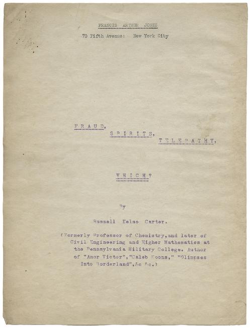 [Spiritualism Typescript] Carter, Russell Kelso (American, 1849—1928). Fraud, Spirits, Telepathy – Which? Baltimore, ca. 1920. A book-length typescript with ink annotations, signed by the author on last foreword page. Comprising 6 unnumbered leaves [table of contents, sheet of alternate titles, proposed list of illustrations] + 108 pages (4to) on rectos only, and two halftone plates. Accompanied by a second typescript, entitled “The Sky Smugglers”, a 14-page short story, bearing several ink annotations. The longer work, believed to be unpublished, is an apparently autobiographical telling of the author’s experiences in spiritualism and magic and discusses mediums and magicians including Henry Slade, Eusapia Palladino, Frederick Eugene Powell, The Mahatmas, Charles Foster, and others. Carter wrote extensively on the subjects of faith healing and Christianity, and published several novels under the pen name Orr Kenyon. He wrote at least one other work on spiritualism, “Glimpses of Borderland” (1918). An anecdote told by one of Carter’s colleagues at Pennsylvania Military College appears in Houdini’s “A Magician Among the Spirits” and recounts their attendance at a séance by Slade.