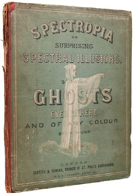 [Brown, J. H.] Spectropia; or Surprising Spectral Illusions Showing Ghosts Everywhere and of Any Colour. New York: James G. Gregory, 1864. Publisher’s pictorial cloth-backed boards. Sixteen illustrations, being hand-colored plates of ghosts, witches, and skeletons. 4to. Spine and covers chipped and stained, flyleaf tearing; good. Toole Stott 777.