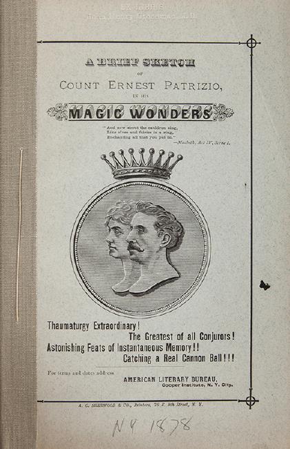 Brief Sketch of Count Ernest Patrizio in His Magic Wonders, (A). New York: A.G. Sherwood & Co., (1878). Engraved pictorial wrappers, rear bearing a stage conjuring image. Illustrated with scenes of the magician’s illusions. 8vo. p. [1] 2—24. Pamphlet binding. Near fine.