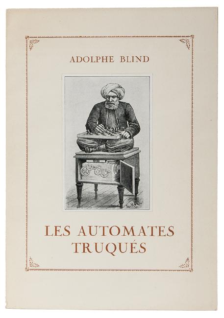 Blind, Adolphe. Les Automates Truques. Paris: Bossard, 1927. Pictorial softcovers with laid image of chess-player. Illustrated. 4to (pages uncut). Enclosed publisher’s advt. for the two-volume work on automata by Chapuis and Gelis, and two letters (1970s) from the author’s descendant, Elisabeth Blind.