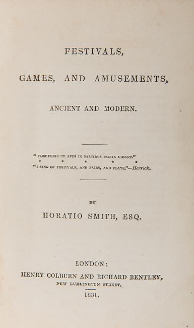 Smith, Horatio. Festivals, Games, and Amusements, Ancient and Modern. London: Henry Colburn, 1821. Engraved frontispiece and two fold-out plates (including plan of Olympia). Uncut. Rebound in quarter gilt-lettered navy morocco over matching marbled boards. Renewed endpapers. 12mo.