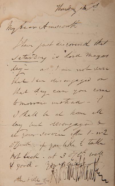 Cruikshank, George. Jerrold, Blanchard. The Life of George Cruikshank. In Two Epochs. London: Chatto and Windus, 1882. Two volumes. Autographed letter signed by Cruickshank tipped in. One page. Thursday [date illeg.], to Ainsworth. Profusely illustrated. Bound in red straight-grain morocco gilt by Riviere and Sons. Marbled endpapers. T.e.g. Gilt turn-ins. 12mo. Dampstain along top edge first few pages.