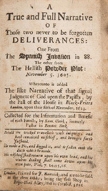 Clarke, Samuel. [England’s Remembrancer]. A True and Full Narrative of Those Two Never to Be Forgotten Deliverances: One from the Spanish Invasion in 88. The Other from the Hellish Powder Plot. London: J. Hancock, 1671. Two parts in one volume, with separate title pages. Folding frontispiece (large portion of image torn away). Contemporary sheep. 8vo. Marginal worming toward end of volume. Scarce.