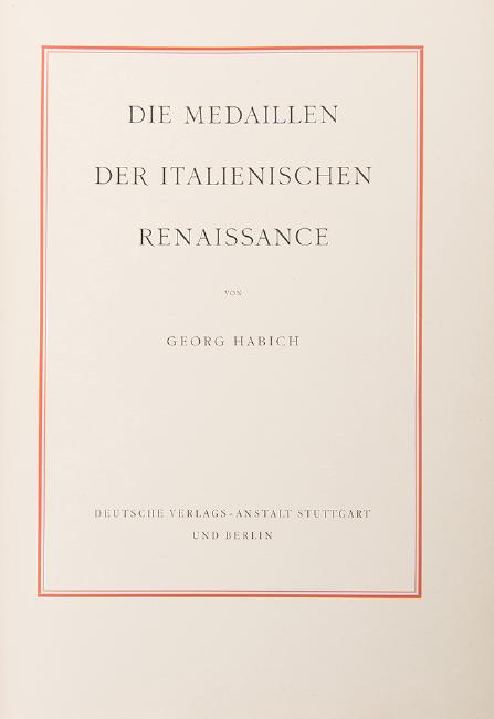 [Medals] Habich, Georg. Die medaillen der Italienischen Renaissance. Stuttgart and Berlin, n.d. Folio. Red cloth. Gilt-letterd. Profusely illustrated with black and white plates. Rubbing to cloth, manuscript ex-libris to front pastedown.