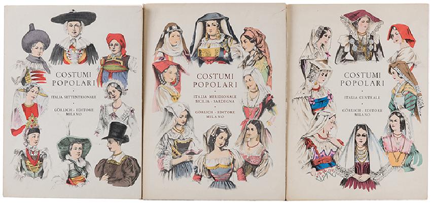 [Costume. Italian] Costumi popolari Italiani. Milano: Gorlich Editore, (1956). Three volumes. Limited edition. 247 plates. Contents loose as issued in original illustrated wraps. Folio. Fine.