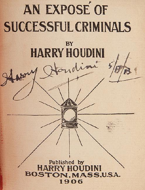 Houdini, Harry (Ehrich Weiss). The Right Way to Do Wrong. Boston, 1906. Signed by Houdini on the title page: “Harry Houdini, 5/17/13.” From the Magicians’ Club (London) Collection, being a presentation copy from Will Goldston (signed on verso of frontispiece). Numerous club ink stamps. Publisher’s pictorial wrappers. Illustrated. 8vo. Old tape repairs to spine and back cover, corners and edges worn.