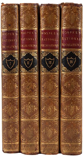 Hooper, William. Rational Recreations. London: L. Davis, J. Robinson, B. Law, and G. Robinson, 1787. Third Edition. Four volumes, contemporary calf with decoratively gilt-stamped spines and edges. Illustrated with 65 engraved folding plates. 8vo. Scuffing on covers and wear on spine edges, but internally fine. Toole Stott 391.