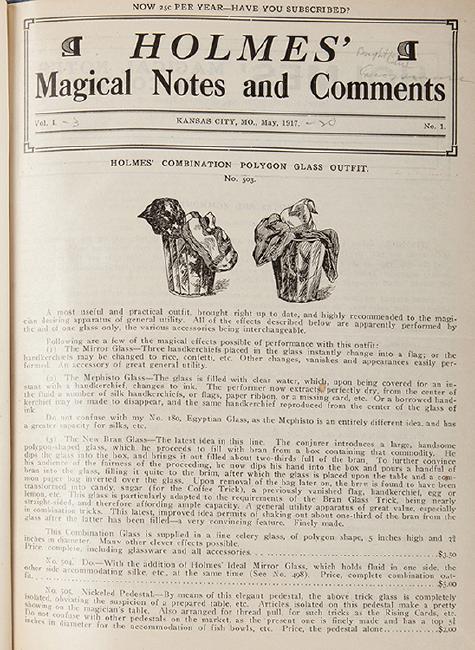 Holmes’s Magical Notes and Comments. Donald Holmes. V1 N1 (May 1917) – V3 N12 (Oct. 1920). Complete file. Bound in a single buckram volume. Writing on FFEP, browning on some issues; very good. Scarce. Alfredson/Daily 2745.