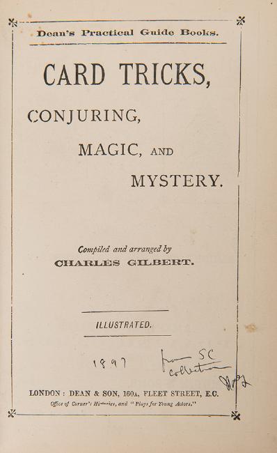 Gilbert, Charles. Card Tricks, Conjuring, Magic and Mystery. London: Dean & Son, ca. 1897. Contemporary blue board with leather spine and corners, gilt spine and title compartment. Illustrated, with diagrams. 8vo. Ex-libris Sir David Salomons Bart. Writing on title page, light discoloration; very good.