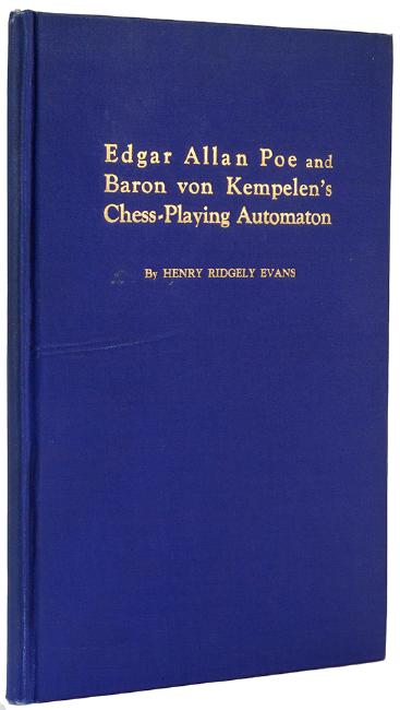 Evans, Henry Ridgely. Edgar Allan Poe and Baron von Kempelen’s Chess-Playing Automaton. Kenton, 1939. Publisher’s blue cloth stamped in gilt. Halftone frontispiece, plates. 8vo. Rippling to cloth, else very good.