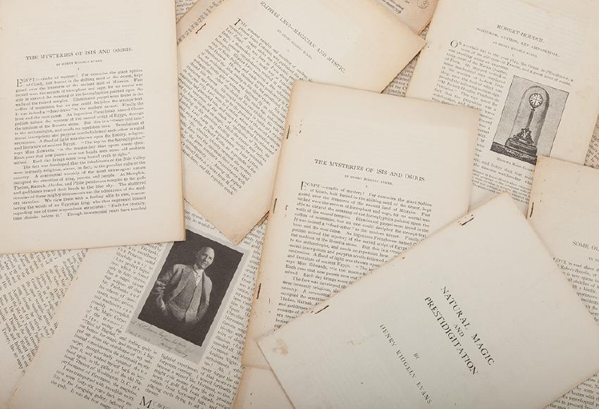 Evans, Henry Ridgely. Group of Eight Pamphlets, and One Corrected Essay. Including a six-page proof copy of “The Astounding Career of Giacomo Casanova” (posthumously published “Casanova—Pretender to Magic and Cabalism” in Linking Ring [V31 N12 (Feb. 1952]), containing several segments deleted or rewritten for publication; staple-bound pamphlets from Open Court including “Elias Levi – Magician and Mystic”; “Mysteries of Isis and Osiris”; “Natural Magic and Prestidigitation”; “Robert-Houdin”; and “Some Old Time Conjurers”; “Magicians and Freemasonry” (extract from The Master Mason); and “The Magic Mirror” (reprinted from The New Age [1905]).