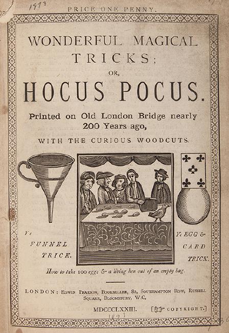 Dean, Henry. Wonderful Magical Tricks; or Hocus Pocus. London: Edwin Pearson, 1873. Gathering of four leaves, illustrated with woodcuts, in cloth-backed plain boards. 4to. p. [1-3] 4-8. Ex-C.A. George Newmann Collection (blind-stamped added flyleaf). Toole Stott 234. Rare.