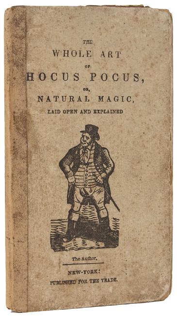 [Dean, Henry] The Whole Art of Legerdemain; or Hocus Pocus Laid Open and Explained. New York: N.C. Nafis, 1833. Cream pictorial cloth-backed boards. Folding frontispiece showing a conjurer nailing a card to a wall with a pistol shot. 12mo. Ex-libris Roland Winder. Scattered light or mild foxing, boards rubbed. Toole Stott 724.