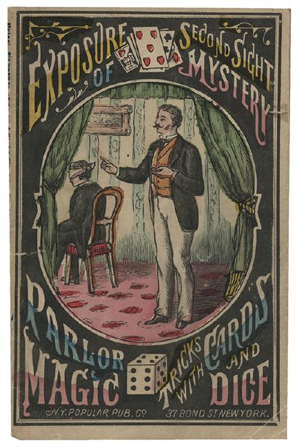 Exposure of Second Sight Mystery, Parlor Magic and Tricks with Cards. New York: New York Popular Publishing Co., 1883. Lovely hand-colored pictorial wrappers. Illustrated. 12mo. Two old cello-tape repairs, address label at foot of title page.