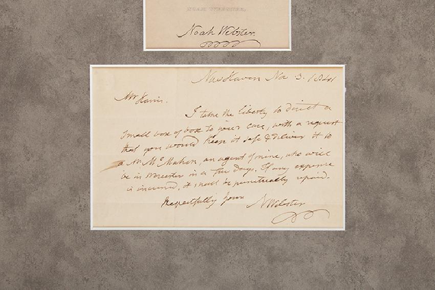 Webster, Noah. Autographed Note Signed. One page. New Haven, CT. November 3, 1841. To Mrs. Harris, regarding a set of books. Matted with an engraved portrait. Fine.