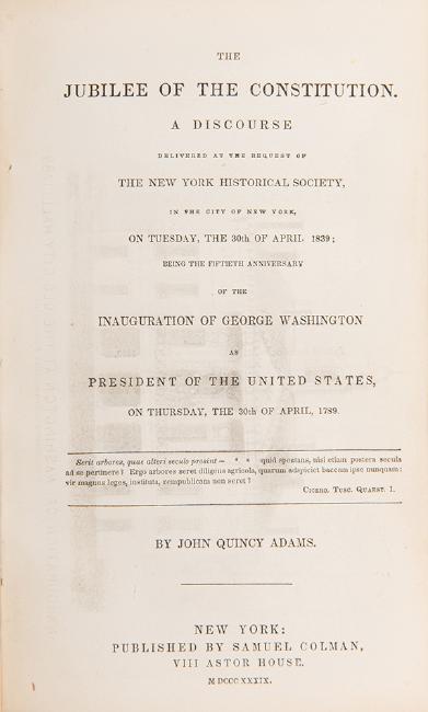 Adams, John Quincy. The Jubilee of the Constitution. A Discourse. New York: Samuel Colman, 1839. First edition. Inscribed by John Quincy Adams to Josiah Adams. Original brown cloth. Thin 8vo.