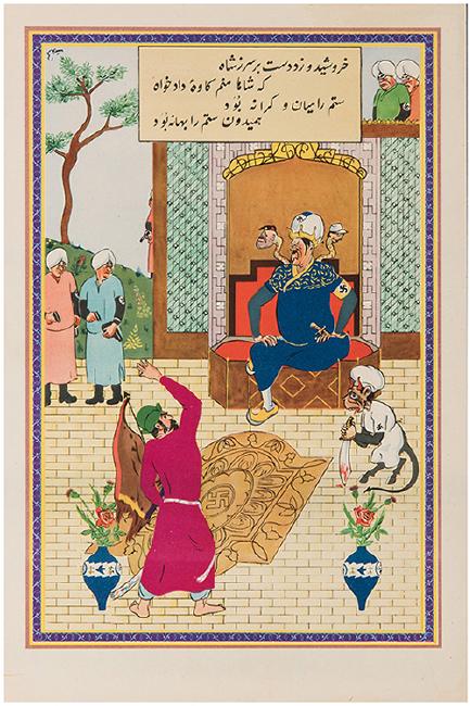 [WWII] Kimon Evan Marengo (1904—88). Set of Five Anti-Nazi Posters. [London]: KEM, ca. 1943. Color posters with Persian/Farsi text, depicting Hitler as the evil King Zahak, in scenes adapted from the epic poem by Shahnameh of Ferdowski. 13 ½ x 9" each. Colored pencil annotations in top margin of one print.