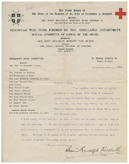 [WWII] Churchill, Jennie (Lady Randolph Churchill). Wartime TLS from the Mother of Winston Churchill to the editor of Punch. Typed letter signed ("Jennie Randolph Churchill"), one page, on The Order of the Hospital of St. John of Jerusalem in England letterhead, London, September 28, 1914. To Sir [John] Owen, the editor of Punch magazine, regarding materials and correspondence from The Order and some of its members for use in a referenced Cartoon. 4to (8 x 10"). Creased in quarters.