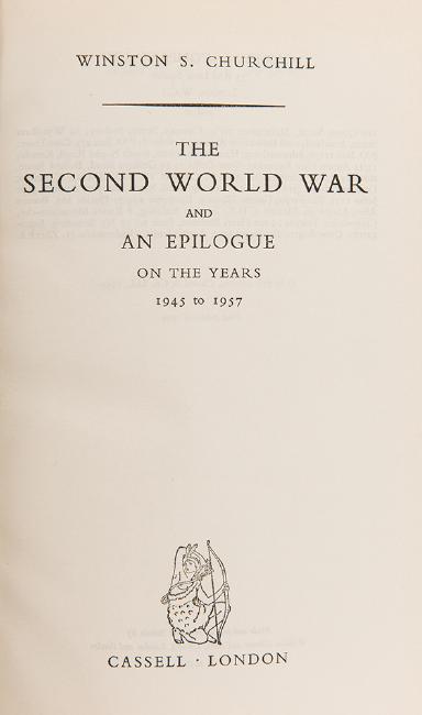 [WWII] Churchill, Winston. The Second World War and an Epilogue on the Years 1945 to 1957. London: Cassell, 1959. First edition bound by Bayntun. Full smooth red calf. A.e.g. Gilt inner dentelles. Gilt-lettered spine. 8vo.