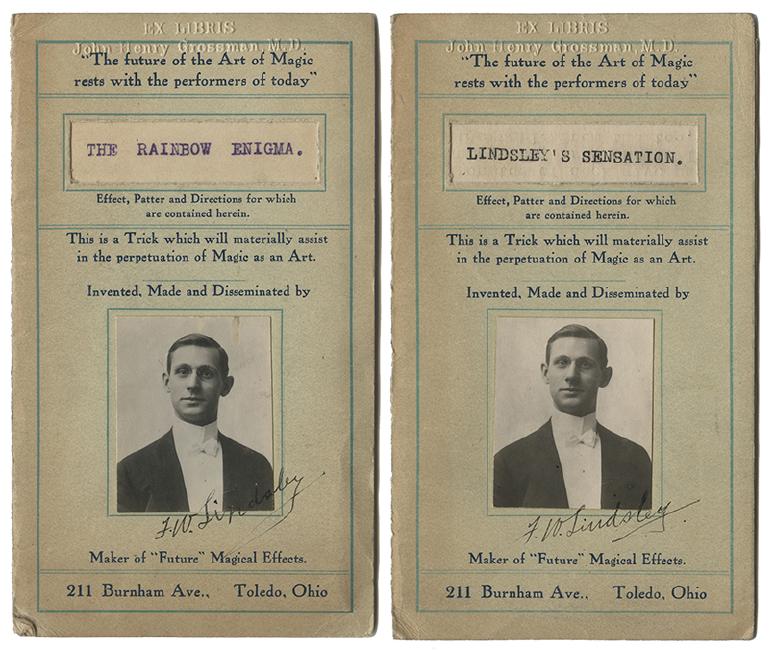 Lindsley, F. W. Two Signed Magic Booklets. Toledo, ca. 1910s [?]. Typed magical effects instructions (4to) for “Lindsley’s Sensation” and “Rainbow Enigma” [1 and 3 pages, respectively] folded and bound in folders bearing tipped-on photos of the author, both signed on the front cover by Lindsley, the second title signed again on the third page. Uncommon.