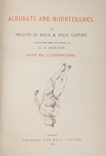 Le Roux, Hughes and Jules Garnier. Acrobats and Mountebanks. London: Chapman and Hall, 1890. One third leather over pebbled cloth. Marbled endsheets and page edges; spine handsomely tooled in gilt with morocco labels gilt stamped. 233 illustrations. 4to. Rubbing and chipping; very good. Handsome binding.